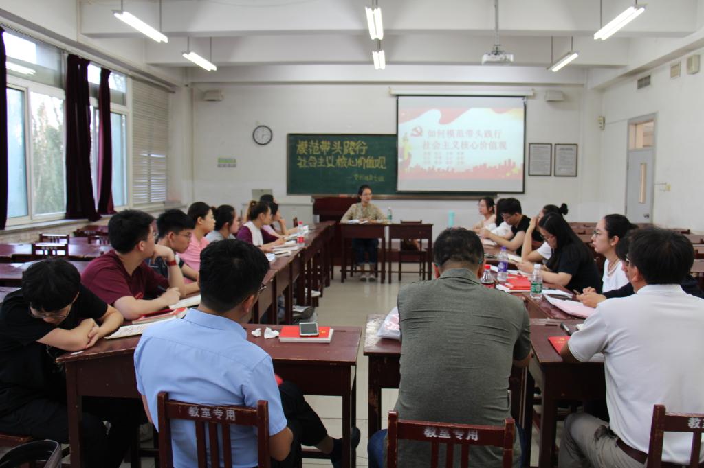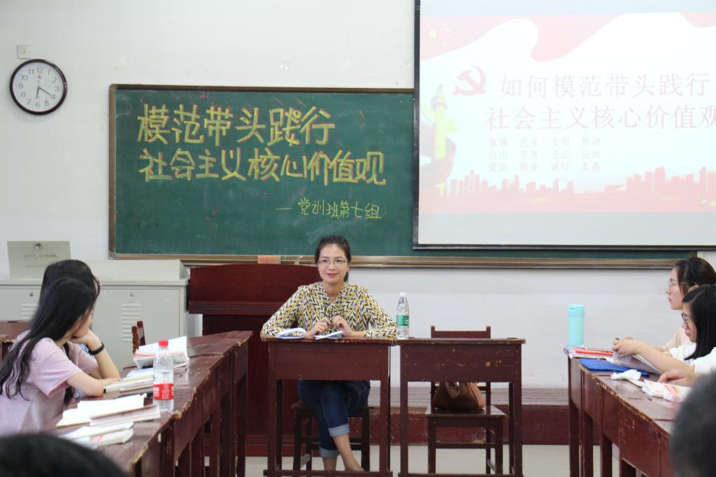 本次党课以“模范带头践行社会主义核心价值观”为主题。党课伊始,朱龙姝老师结合十九大报告与自身经历从不同的方面对社会主义核心价值观进行了细致详尽的讲解,并与学员们一起讨论了和谐的含义。学员们就自身对于和谐的理解进行了发言。朱龙姝老师根据学员们的发言进行总结。随后学员们对如何带头践行社会主义核心价值观进行了讨论发言,他们从爱国、敬业、诚信、友善四个个人层面的社会主义核心价值观要求进行了详细阐述,表示一定带好头践行社会主义核心价值观。
