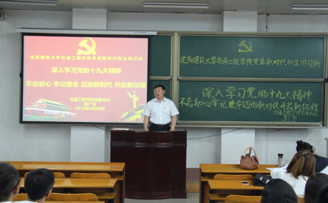 62018:30在乙3101,交通工程学院党委新时代师生讲习所开讲,学院党委书记窦广会同志为学院党支部书记、全体学生党员、积极分子进行了题目为“深入学习党的十九大精神·不忘初心 牢记使命 迈向新时代 开启新征程”的专题讲座。
